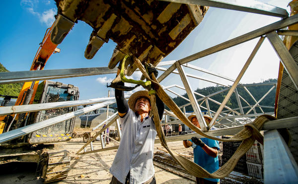 目前,災后重建工作正在有序的進行,利用起重設備配合吊裝帶完成倒塌房屋構件及物資的吊裝,省時省力,加快重建速度。
